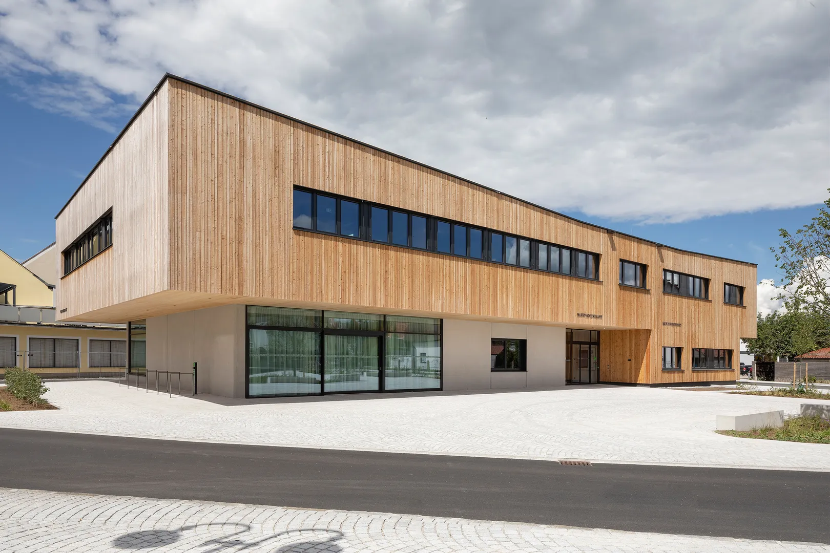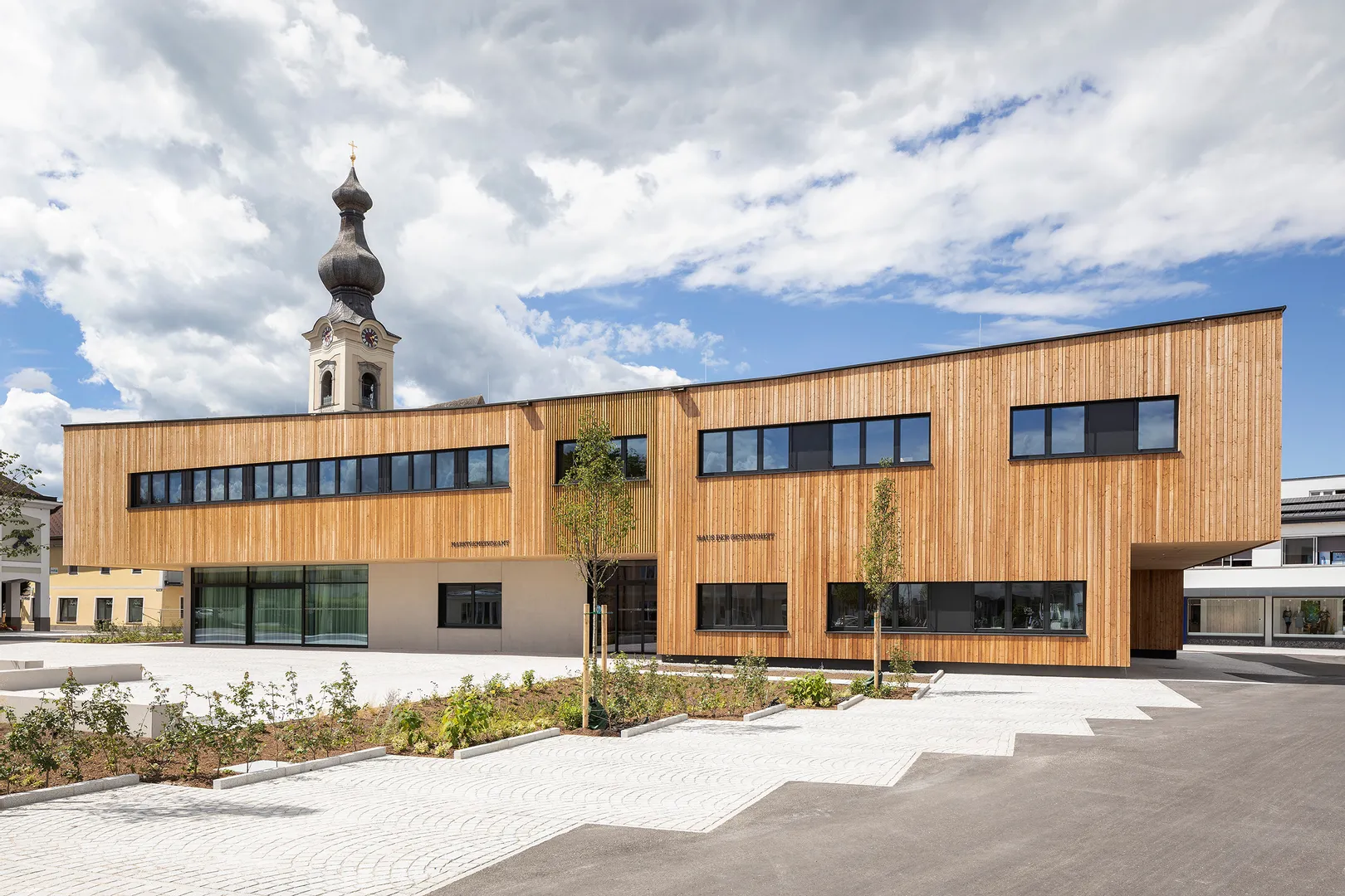 • Das Gemeindezentrum umfasst ein Amtshaus mit einem großzügigen Veranstaltungssaal und vereint verschiedene Funktionen unter einem Dach. Es ist ein bedeutender Beitrag zur Belebung des Ortskerns von Vöcklamarkt. Um den Anforderungen an die Gebäudesicherheit gerecht zu werden, wurden die großen Feuerschutzportale als 1- und 2-flügelige Varianten ausgeführt. Dabei wurden auch die gängigen Fluchtwegnormen sorgfältig berücksichtigt, um im Ernstfall eine sichere Evakuierung zu gewährleisten.