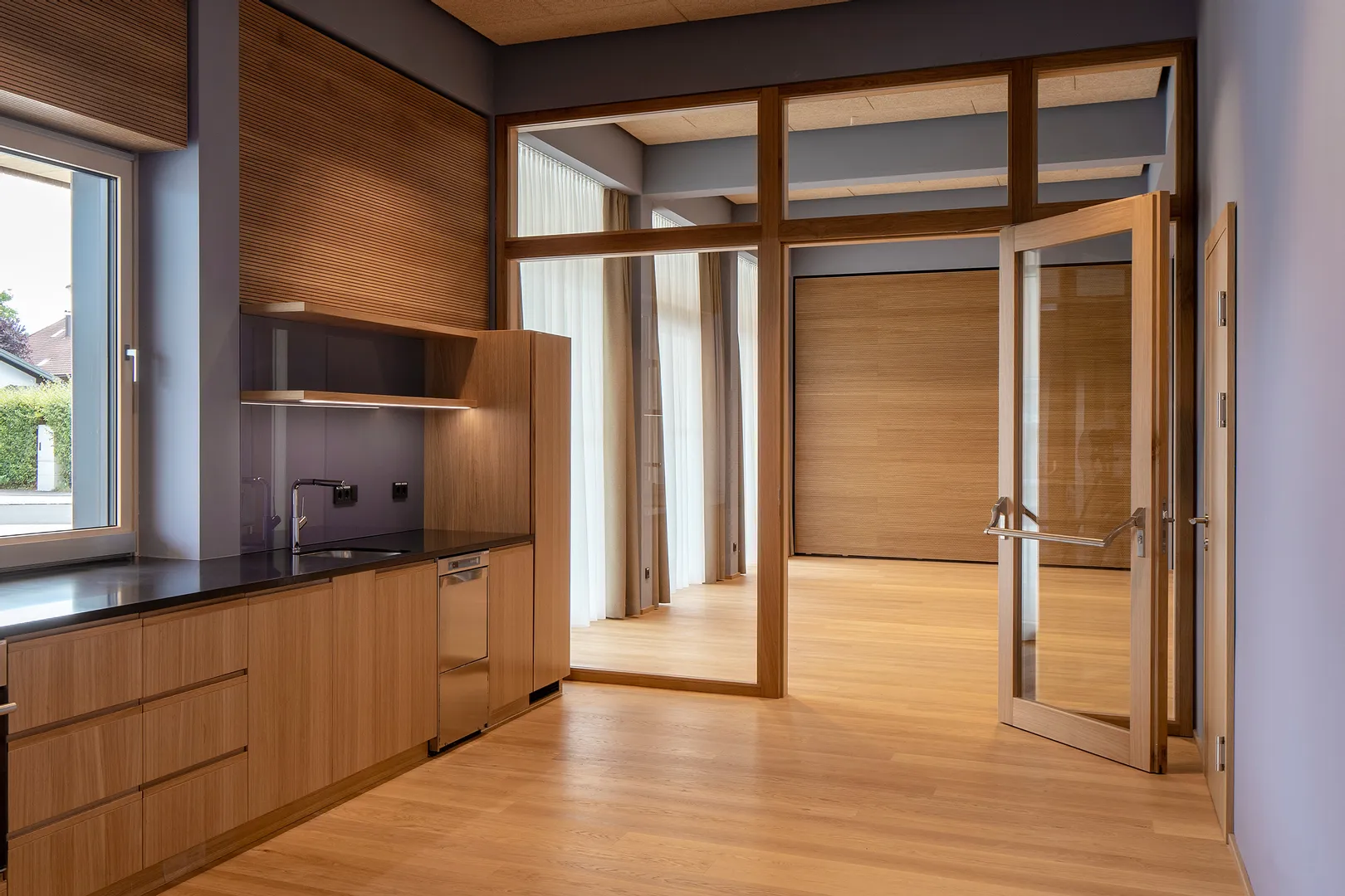 • Ein weiterer Aspekt, der bei diesem Projekt eine entscheidende Rolle spielte, war der hohe Schallschutz. Um ungestörte Veranstaltungen und eine ruhige Arbeitsumgebung zu ermöglichen, haben wir spezielle schalldämmende Eigenschaften in die Türen integriert. Darüber hinaus wurden einige Türen mit Motorschlössern ausgestattet, um den Bedienkomfort zu verbessern und gleichzeitig die Sicherheit zu erhöhen.